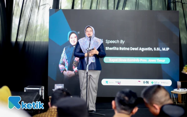 Kadiskominfo Jatim Sherlita Ratna Dewi di acara puncak Anniversary ke-3 Ketik.com di Graha Ketik, Kota Malang, 9 September 2025. (Foto: Dok. Ketik)