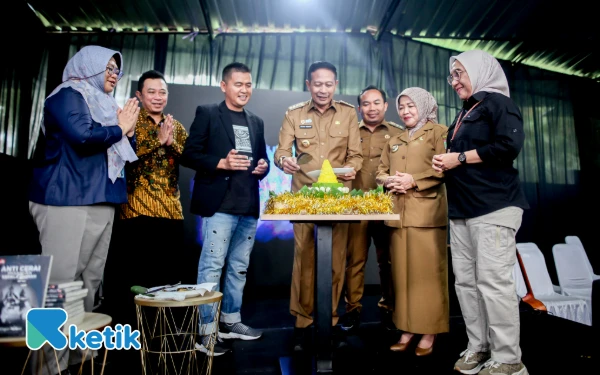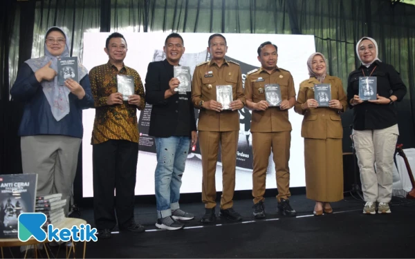 Wali Kota Malang Wahyu Hidayat, Bupati Bondowoso Abdul Hamid Wahid, Wakil Wali Kota Malang Ali Muthohirin, Wakil Bupati Malang Lathifah Shohib, Kadiskominfo Jatim Sherlita Ratna Dewi Agustin, Kadis Peternakan Jatim Indyah Aryani, melaunching Buku karya CEO Ketik.com Kiagus Firdaus berjudul 'Anti Cerai Pasangan Kepala Daerah' terbitan Elexmedia Komputindo di acara puncak Anniversary ke-3 Ketik.com di Graha Ketik, Kota Malang, 9 September 2025. (Foto: Khaesar/Ketik)