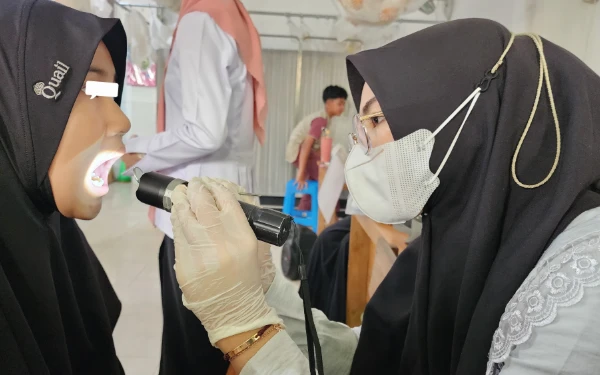 Momen dokter gigi muda Talitha Fatimah memeriksa kesehatan gigi seorang anak. (Foto: Talitha for Ketik.co.id)