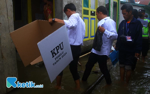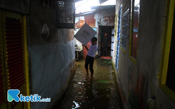 Anggota Kelompok Penyelenggara Pemungutan Suara (KPPS) yang bertugas di Tempat Pemungutan Suara (TPS) 009 Kelurahan 36 Ilir, Kecamatan Gandus memanggul bilik suara melewati banjir usai mendatangi warga yang tidak dapat memilih akibat sakit, Sabtu (24/2/2024). Sebanyak 20 TPS di Kota Palembang melakukan Pemilihan Suara Lanjutan (PSL) untuk memilih DPRD Kota Palembang dan DPRD Provinsi Sumatera Selatan. Wahyu Rahmanto/Ketik.co.id