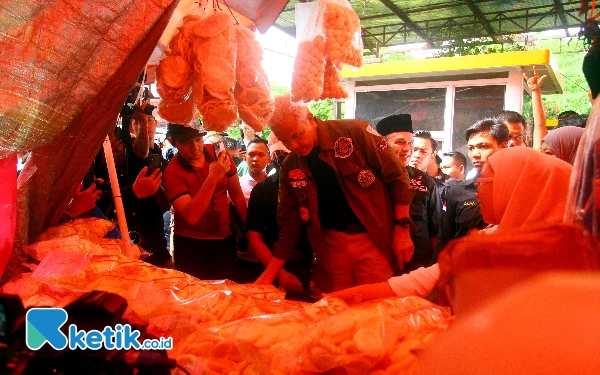 Calon Presiden no urut 3 Ganjar Pranowo membeli kerupuk dalam kampanye blusukan di Pasar 16 Ilir Palembang, Sumatera Selatan, Jumat (2/2/2024). Ganjar Pranowo juga menyempatkan makan pempek dipinggir jalan di kawasan Pasar 16 Ilir sambil mendengarkan keluhan masyarakat soal sembako yang tidak stabil. Wahyu Rahmanto/Ketik.co.id