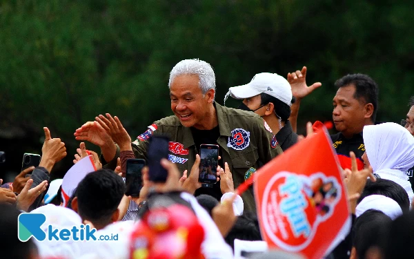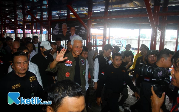 Calon Presiden no urut 3 Ganjar Pranowo menyapa pendukungnya saat melakukan kampanye di Pasar 16 Ilir Palembang, Sumatera Selatan, Jumat (2/2/2024). Ganjar Pranowo melakukan kampanye dengan cara blusukan ke dua pasar yaitu Pasar Palimo dan Pasar 16 Ilir serta mendengarkan keluh kesah pedagang pasar dan pengemudi ketek. Wahyu Rahmanto/Ketik.co.id