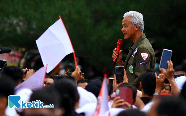 Calon Presiden no urut 3 Ganjar Pranowo saat berorasi politik di depan masa pendukungnya dalam kampanye blusukan nya di Pasar 16 Ilir Palembang, Sumatera Selatan, Jumat (2/2/2024). Wahyu Rahmanto/Ketik.co.id