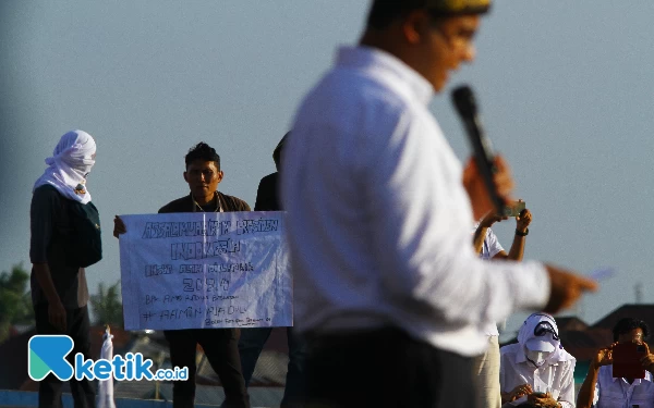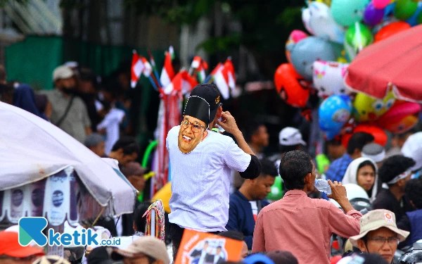 Dengan menggunakan topeng yang menyerupai Calon Presiden No Urut 1 Anis Rasyid Baswedan, masyarakat antusias menunggu kedatang Anis Baswedan dalam kampanye Akbar di Pelataran Benteng Kuto Besak Palembang, Kamis (25/1/2024). Dalam kampanye tersebut dihadiri juga alim ulama se Sumatera Selatan dan menyatakan sikap untuk mendukung Calon presiden No Urut 1 Anis Rasyid Baswedan menjadi Presiden. Wahyu Rahmanto/Ketik.co.id