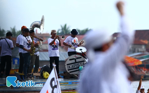 Dengan menggunakan perahu, pemain musik tanjidor ikut meramaikan kampanye akbar calin Presiden No Urut 1 Anis Rasyid Baswedan di Pelataran Benteng Kuto Besak Palembang, Kamis (25/1/2024). Wahyu Rahmanto/Ketik.co.id