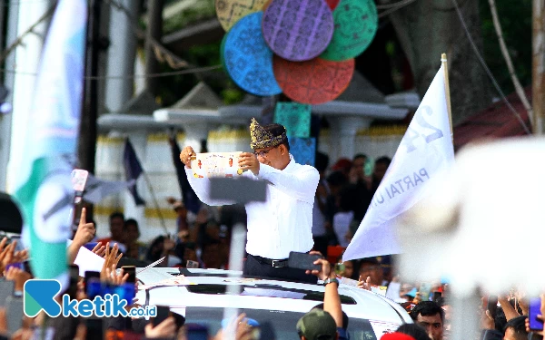 Dengan menggunakan mobil, Calon Presiden No Urut 1 Anis Rasyid Baswedan menyapa pendukungnya saat menghadiri kampanye Akbar di Pelataran Benteng Kuto Besak Palembang, Kamis (25/1/2024). Dengan menggunakan tanjak sebagai ikat kepala yang dibuat dari kain songket. Wahyu Rahmanto/Ketik.co.id