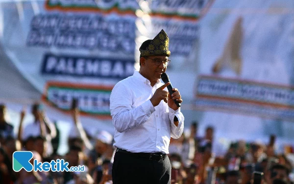 Calon Presiden No Urut 1 Anis Rasyid Baswedan saat berorasi politik dalam kampanye akbar di Pelataran Benteng Kuto Besak Palembang, Kamis (25/1/2024). Wahyu Rahmanto/Ketik.co.id