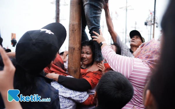 Warga lain termasuk juga para ibu ikut beramai-ramai membantu peserta panjat pinang perempuan yang kesulitan. (Foto: Wisnu Akbar Prabowo/Ketik.co.id)