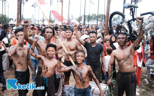 Foto bersama salah satu tim pemanjat pinang yang telah berhasil menurunkan seluruh hadiah. (Foto: Wisnu Akbar Prabowo/Ketik.co.id)