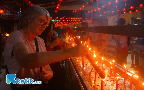 Penyalaan lilin pelita oleh warga keturunan Tionghua dalam perayaan tahun baru Imlek 2575 di Wihara Dharmakirti Palembang, Sabtu (10/2/2024). Penyalaan lilin tersebut sebagai bentuk kebersihan serta penerangan hati agar menerangi kehidupan selama setahun ini. Wahyu Rahmanto/Ketik.co.id