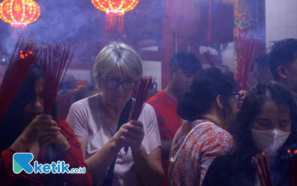 Warga negara asing (kaos putih) saat mengikuti ritual sembahyang di Kelnteng Dewi Kwan Im Palembang, Sabtu (10/2/2024). Masyarakat Tionghoa merayahkan tahun baru Imlek 2575 yang jatuh pada tanggal 10 Febuari 2024 bertepatan dengan tahun Naga Kayu yang dianggap sebagai tahun yang membawa peluang baik dan kemajuan. Wahyu Rahmanto/Ketik.co.id