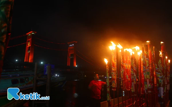 Petugas Kelenteng Dewi Kwan Im Palembang menyalakan dupa ukuran besar di Pinggir Sungai Musi Palembang, Sabtu (10/2/2024) Pembakaran dupa berukuran besar ini merupakan rangkaian dalam sembahyang bagi masyarakat keturunan Tionghua dalam menyambut Tahun Baru Imlek 2575. Wahyu Rahmanto/Ketik.co.id
