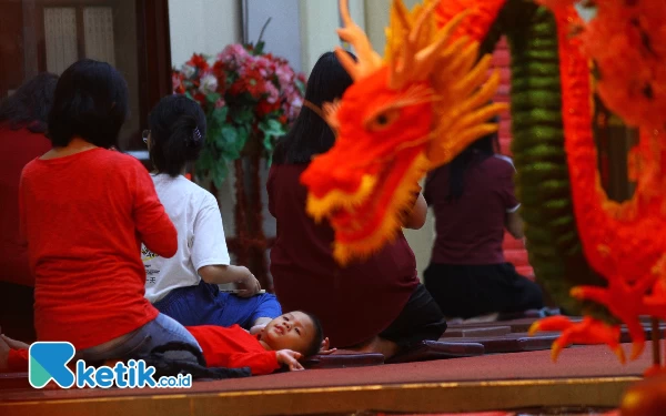 Dengan membawa anak, tampak warga keturunan Tionghua melakukan sembahyang dalam menyambut tahun baru imlek 2575 di Wihara Dharmakirti Palembang, Sabtu (10/2/2024). Tahun baru imlek 2024 yang jatuh pada tahun naga ini sangat ditunggu oleh masyarakat keturuhan Tionghua yang dikarnakan membawa peluang baik dan kemajuan. Wahyu Rahmanto/Ketik.co.id
