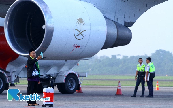 Calon jemaah haji mengabadikan momen keberangkat dengan berswafoto di Bandara Internasional Sultan Mahmud Baddarudin (SMB) II Palembang, Sumatera Selatan, Minggu (12/5/2024). Sebanyak 450 calon jemaah haji kelompok pertama (kloter) pertama yang berasal dari Kabupaten Musi Banyuasin dan Kota Palembang ini diberangkatkan menuju Madina, Arab Saudi untuk menunaikan ibadah haji 2024. (Foto:Wahyu Rahmanto/ketik.co.id).