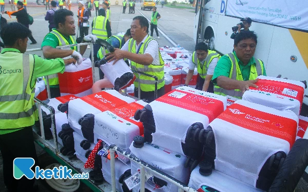 Petugas Bandara Internasional Sultan Mahmud Baddarudin (SMB) II Palembang menyusun koper milik calon jemaah haji untuk dimasukkan ke dalam pesawat, Minggu (12/5/2024). Sebanyak 450 calon jemaah haji kelompok pertama (kloter) pertama yang berasal dari Kabupaten Musi Banyuasin dan Kota Palembang ini diberangkatkan menuju Madina, Arab Saudi untuk menunaikan ibadah haji 2024. (Foto:Wahyu Rahmanto/ketik.co.id).