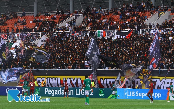 Suporter Sriwijaya FC saat mendukung tim kesayangan mereka dalam lanjutan liga 2 Sriwijaya FC vs PSMS Medan di laga Liga 2 Indonesia di Stadion Gelora Sriwijaya Jakabaring Palembang, Minggu (17/12/2023). Sriwijaya FC ditahan imbang PSMS Medan dengan skor 2-2. Wahyu Rahmanto
