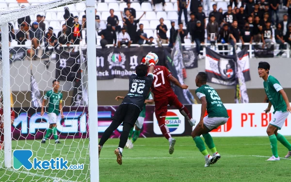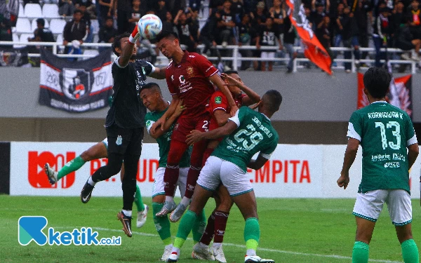 Kiper PSMS Medan berusaha berebut bola atas dengan pemain Sriwijaya FC dalam laga Liga 2 Indonesia di Stadion Gelora Sriwijaya Jakabaring Palembang, Minggu (17/12/2023). Sriwijaya FC ditahan imbang 2-2 oleh PSMS Medan dan menjadi pukulan buat Sriwijaya FC dikarenakan tidak lolos ke liga 1 atas kekalahan tersebut. Wahyu Rahmanto