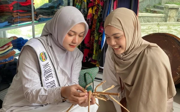 Mojang Purwakarta 2024, Diva Shavanabilla dan founder komunitas @bumikreasi.id Jatiluhur, Tanissa Puti Rahmadiva yang juga Wakil 1 Mojang Purwakarta 2021 nampak akrab saat belajar mengolah eceng gondok (Foto: Moka Purwakarta)