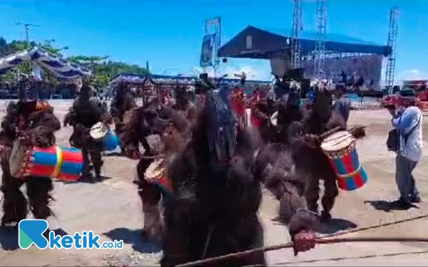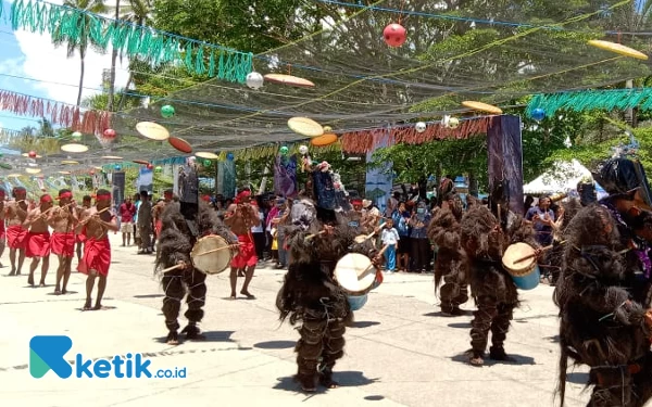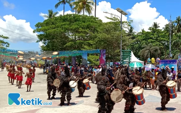Puluhan group Suling Tambur tampil memukau dalam lomba Suling Tambur yang digelar di Pantai WTC, Kota Waisai, Raja Ampat, Papua Barat Daya, Kamis (19/10/2023). Dari sekian banyak group Suling Tambur yang ikut dalam pentas kali ini, terdapat salah satu grup Suling Tambur dari Misool yang menyita perhatian penonton. Group Suling Tambur yang telah diketahui berasal dari Distrik Misool Timur Kab. Raja Ampat itu, telah mengenakan busana tradisional Suku Matbat (Salah satu suku di Raja Ampat). Busana yang dikenakan tersebut biasa disebut sebagai "Setan Gamutu". Penampilan Group Suling Tambur ini sontak menyita perhatian penonton. (FOTO: Abhie/Ketik.co.id)