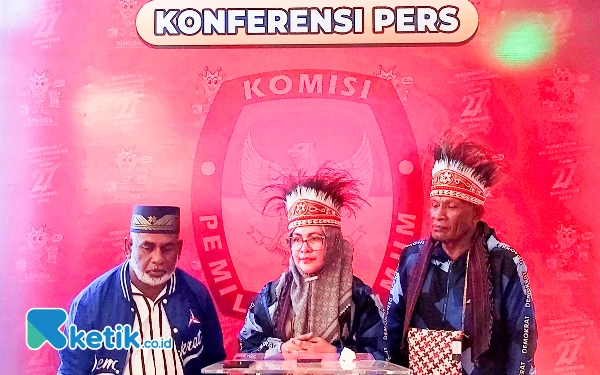 Usai penandatanganan berita acara, pasangan Ria Umlati -Benoni Saleo kemudian melanjutkan konferensi pers. Pada kesempatan itu, Ria Umlati menyampaikan kesiapan dirinya dan pasangannya dalam kontestasi Pemilukada Raja Ampat. "Kami optimis menang dalam Pemilukada ini," ujar Ria, Selasa (27/8). (Foto; Abi/ Ketik.co.id)
