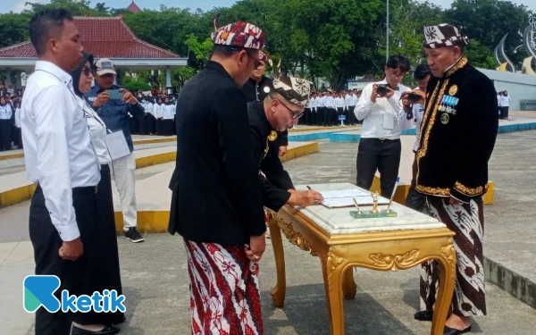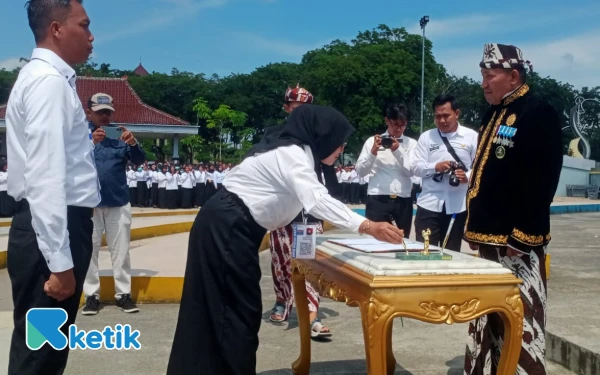 Salah pegawai saat menandatangani kontrak perjanjian tentang keputusan pengangkatan PPPK paruh waktu 2025 (Foto: Mat Jusi/Ketik.com)