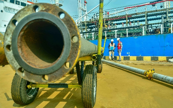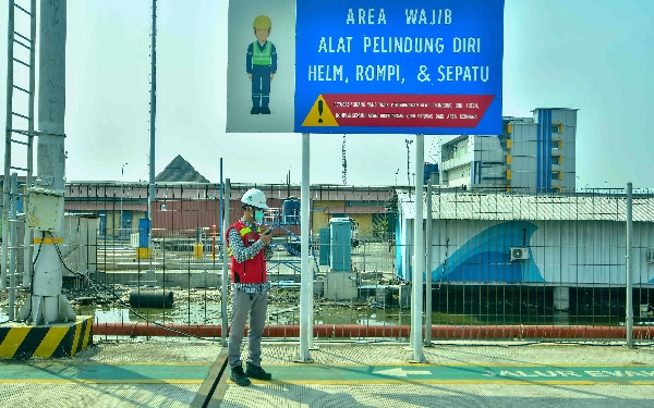 Dua pekerja dengan APD lengkap sedang memantau aktivitas bongkar muat methanol di Pelabuhan Samudera 2 Subholding PT Pelindo Multi Terminal (SPMT) Branch Tanjung Emas Semarang, Rabu (22/5/2024). (Foto: Achmad Fazeri/Ketik.co.id)