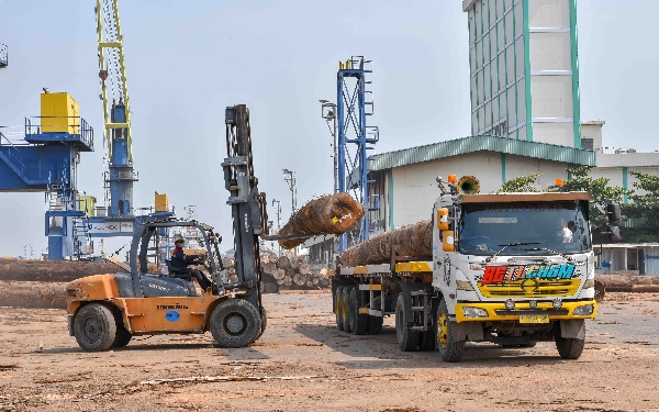 Seorang pekerja dengan APD lengkap melakukan bongkar muat kayu log (gelondong) di Pelabuhan Dalam Subholding PT Pelindo Multi Terminal (SPMT) Branch Tanjung Emas Semarang, Rabu (22/5/2024). (Foto: Achmad Fazeri/Ketik.co.id)