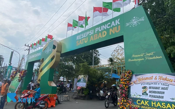 Keramaian di pintu masuk Gor Delta Sidoarjo di Peringatan Harlah NU 1 Abad. (Foto: Shinta/Ketik.co.id)
