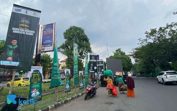 Bendera hijau khas Nahdlatul Ulama (NU) menghiasi seluruh wilayah Sidoarjo dari mulai exit tol hingga jantung Kota Sidoarjo. (Foto: Shinta/Ketik.co.id)