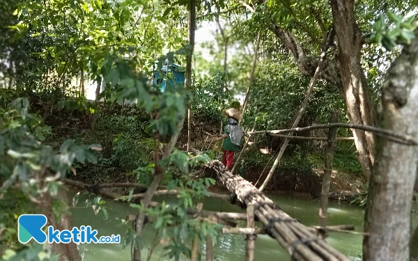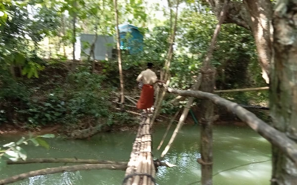 Seorang pria dewasa sedang melewati jembatan bambu hasil swadaya masyarakat yang butuh sentuhan bantuan ( foto : Ach. Suni )