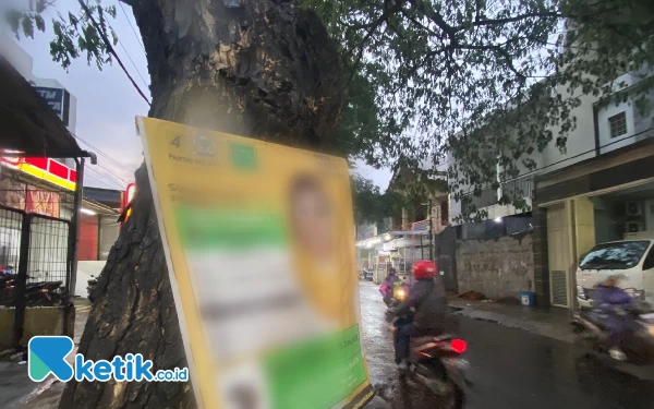 Penempelan baliho Capres yang melanggar aturan dengan memaku di pohon di Kawasan Depan Polda Jatim. (Foto: Shinta Miranda/Ketik.co.id)