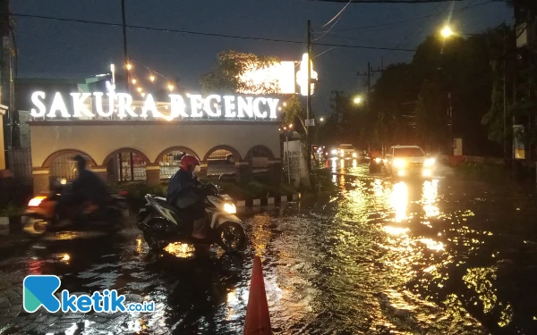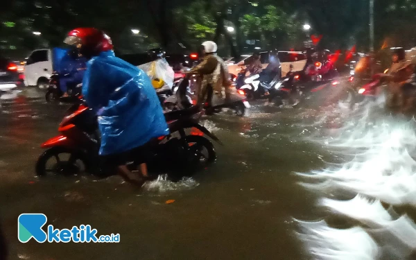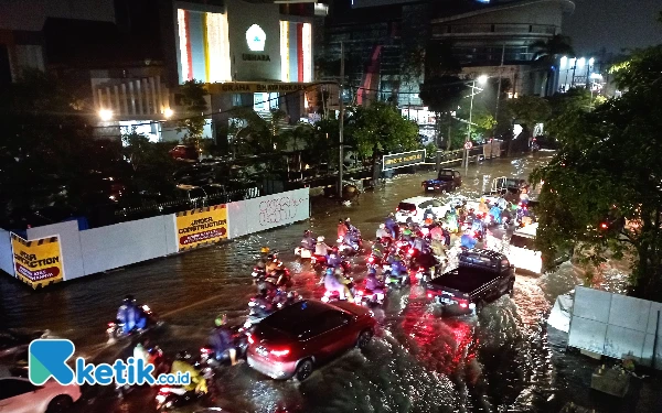 Hujan lebat yang mengguyur kota Surabaya pada Selasa sore, 24 Desember 2024 membuat beberapa jalan protokol kota Pahlawan terendam banjir. (Foto: Samsul/Ketik.co.id)