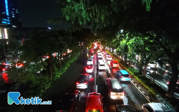 Berdasarkan pantauan Ketik.co.id, kemacetan di jl. Ahmad Yani masih berlangsung hingga pukul 19.00 WIB. Hujan gerimis juga belum reda. (Foto: Samsul/Ketik.co.id)