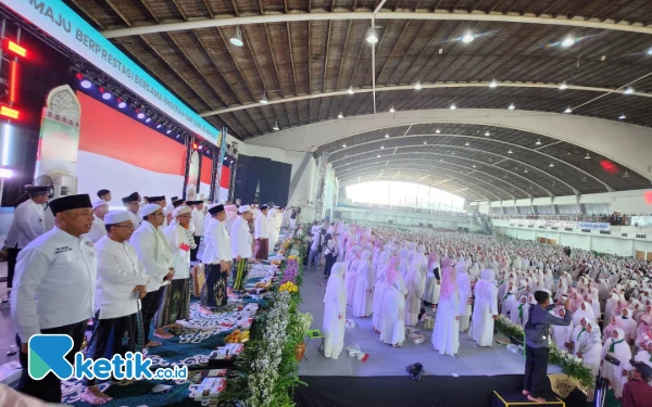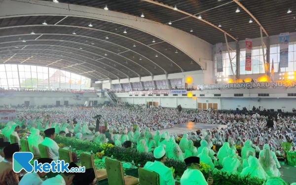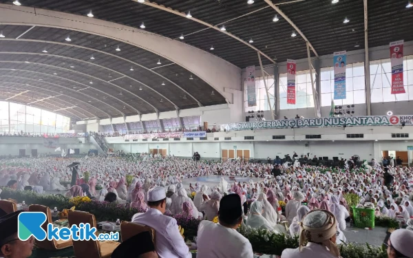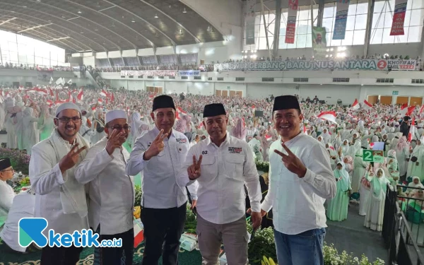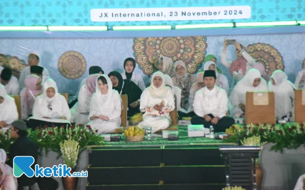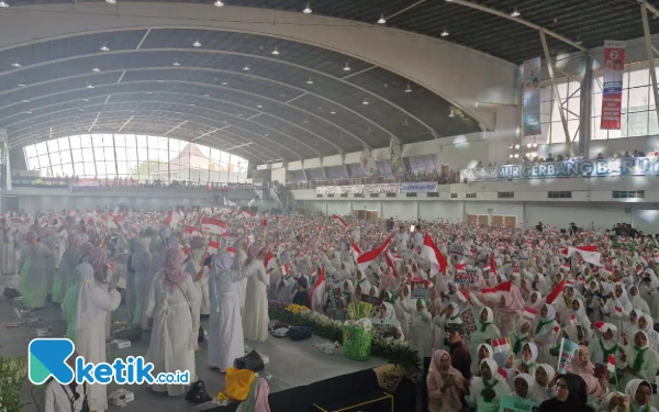 Puluhan ribu masyarakat hadir dalam acara Dzikir, Sholawat dan Doa Bersama Menyambut Kemenangan Pasangan Calon Gubernur Jawa Timur nomor urut 02 Khofifah-Emil di Jatim Expo Surabaya, Sabtu 23 November 2024. (Foto: Naufal A/Ketik.co.id)