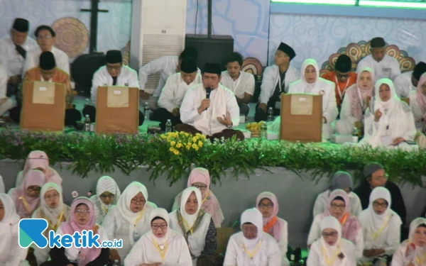 Imam Besar Masjid Nasional Al-Akbar Surabaya KH Ahmad Muzakky, S.Th.I Al Hafidz memimpin langsung acara Doa bersama dan Istighotsah akbar untuk kemenangan Khofifah-Emil di Pilgub Jatim 2024 di Jatim Expo Jl A Yani Surabaya, Sabtu (23/11/2024) ini. (Foto: Khaesar/Ketik.co.id)