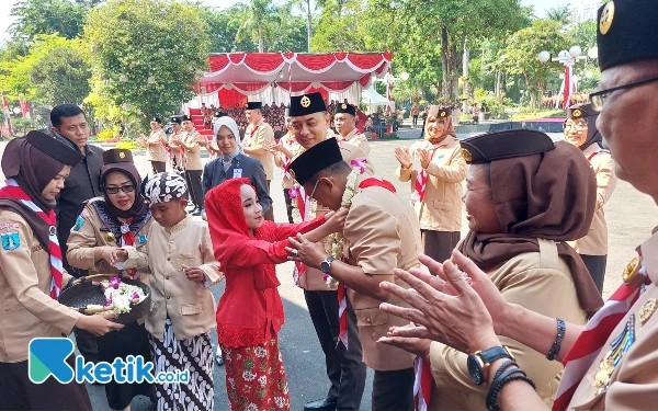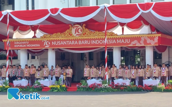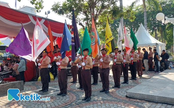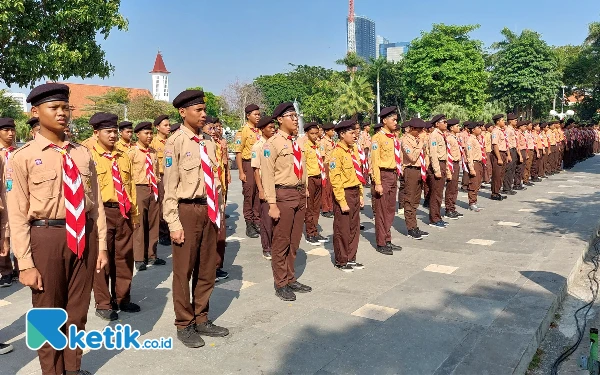 Para peserta Upacara Peringatan Hari Pramuka ke-63 di Balai Kota Surabaya. (Foto: Husni Habib/Ketik.co.id)