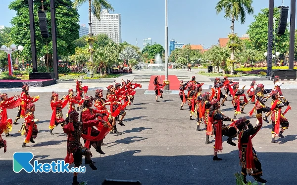 Tari ngeremo memeriahkan peringatan Hari Pramuka ke-63 di Balai Kota Surabaya. (Foto: Husni Habib/Ketik.co.id)