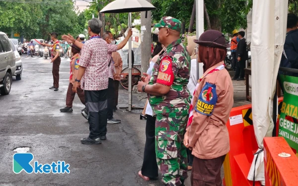 Kakak Pramuka dengan seorang personel TNI memantau arus lalu lintas di depan gereja. (Foto: Fitra/Ketik.com)