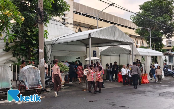 Personel Pramuka telah siap di depan pintu masuk gereja. (Foto: Fitra/Ketik.com)