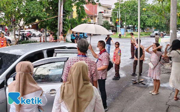 Seorang kakak Pramuka dengan sigap mengarahkan mobil dan kendaraan lain yang hendak menuju gereja. (Foto: Fitra/Ketik.com)