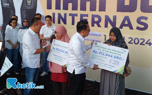 Perayaan May Day Pj Gubernur Jatim Adhy Karyono memberikan santunan dari BPJS Ketenagakerjaan, Rabu (1/5/2024). (Foto: Khaesar/Ketik.co.id)