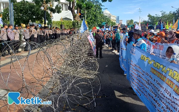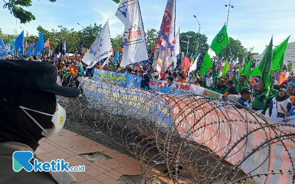 Jalannya aksi demo May Day di depan kantor Gubernur Jatim berlangsung aman dan tertib, Rabu (1/5/2024). (Foto: Khaesar/Ketik.co.id)
