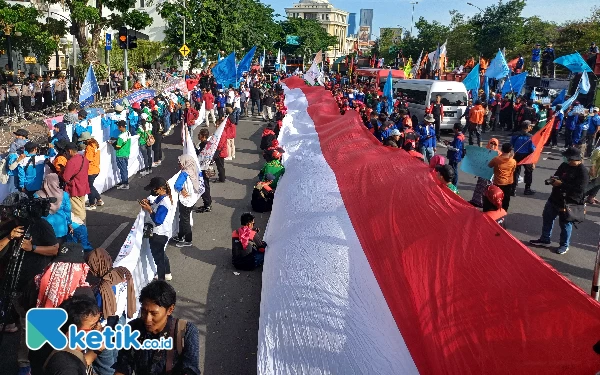 Peserta aksi demo May day tampak membawa bendera merah putih berukuran besar, Rabu (1/5/2024). (Foto: Khaesar/Ketik.co.id)