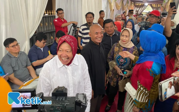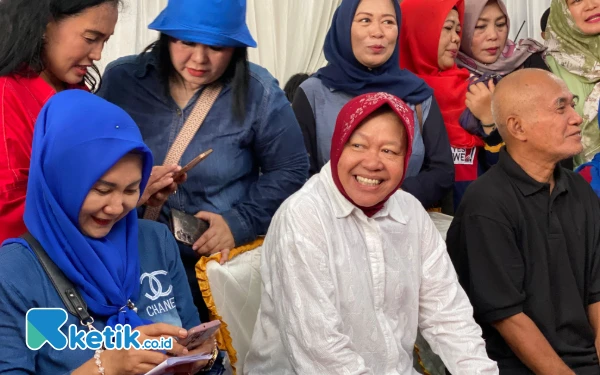 Risma menyapa masyarakat saat datang di TPS 16 Surabaya. (Foto: Shinta Miranda/Ketik.co.id)
