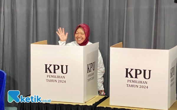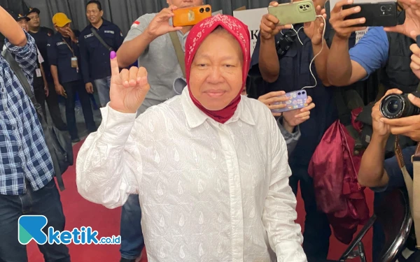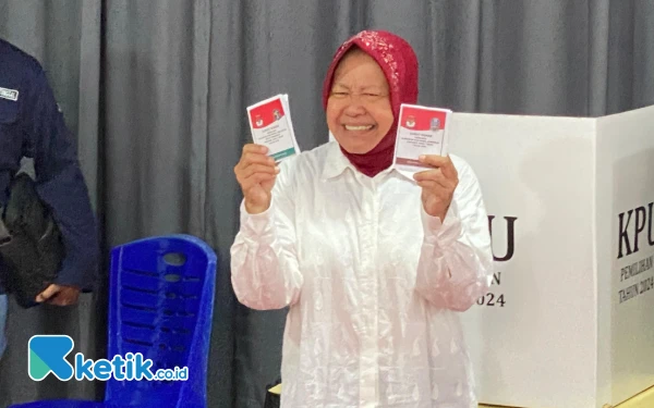 Senyum Semringah Cagub Jatim Tri Rismaharini Berikan Hak Suara di TPS Wiyung Surabaya