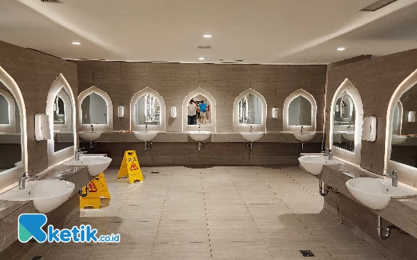 Tempat wudhu dan toilet yang bersih, lengkap dan keren terletak di basement Masjid.