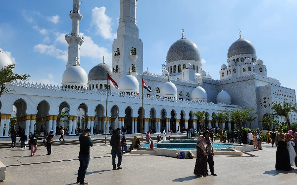Nampak Bendera UEA dan Indonesia berkibar di sisi Utara Masjid Sheikh Zayed yang Mega, Minggu (23/4). (Foto: Kiagu Firdaus/Ketik).